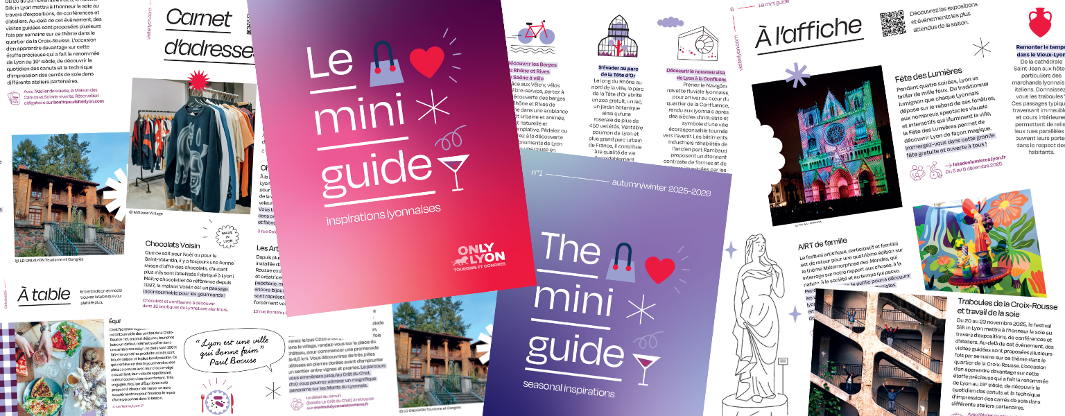 Cette semaine sortira le premier numéro du “mini-guide", un guide bi-annuel destiné aux visiteurs de passage à Lyon et mettant en valeur le dynamisme culturel, culinaire et créatif lyonnais. On vous dit tout sur ce nouveau support qui sera disponible au Pavillon ONLYLYON et que vous pourrez bientôt vous procurer et diffuser dans vos établissements !
